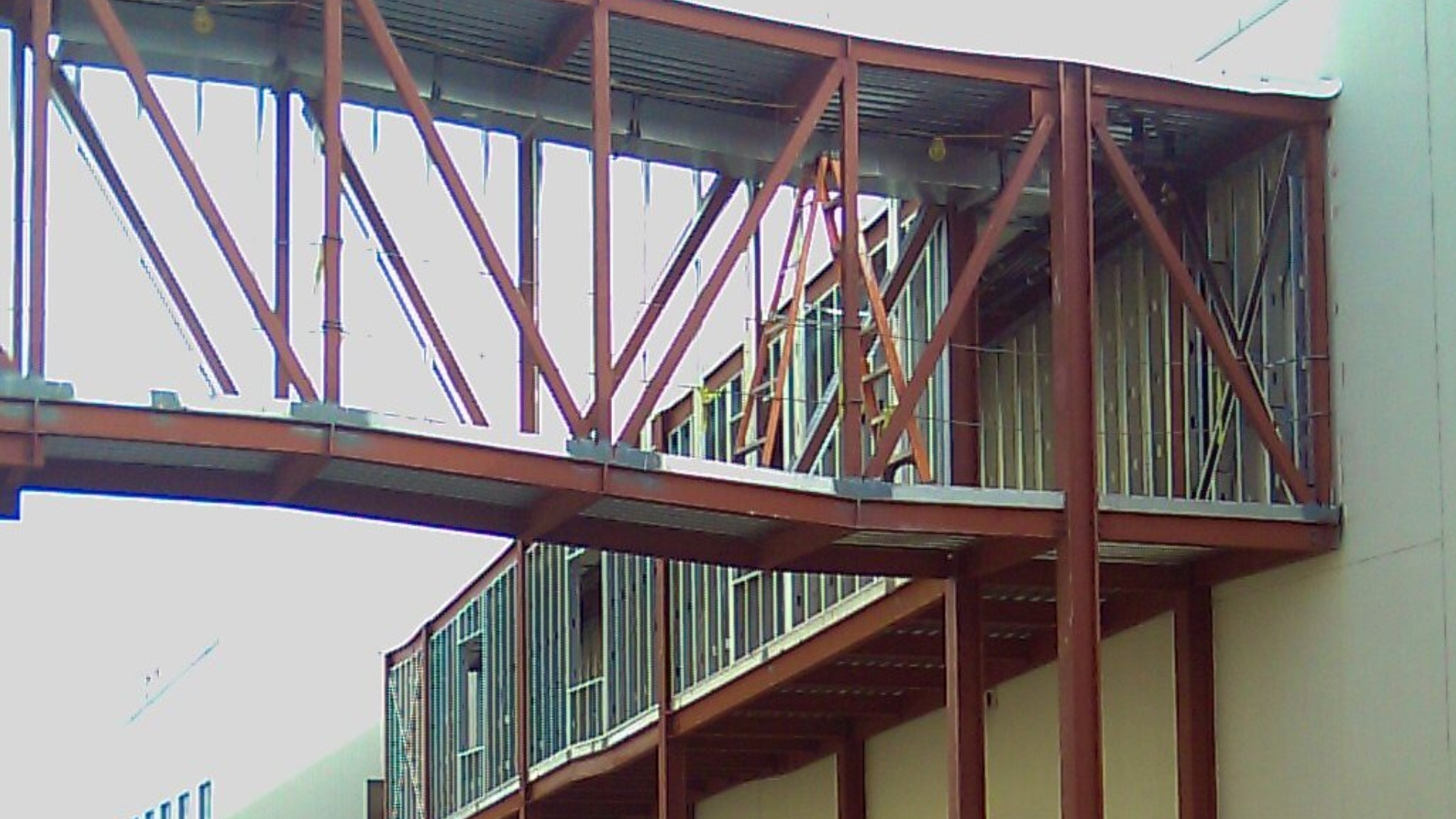 Challenges faced during the design of the connector bridge included the elevation differential and the horizontal offset between the entrances of the COB and Hangar 11.