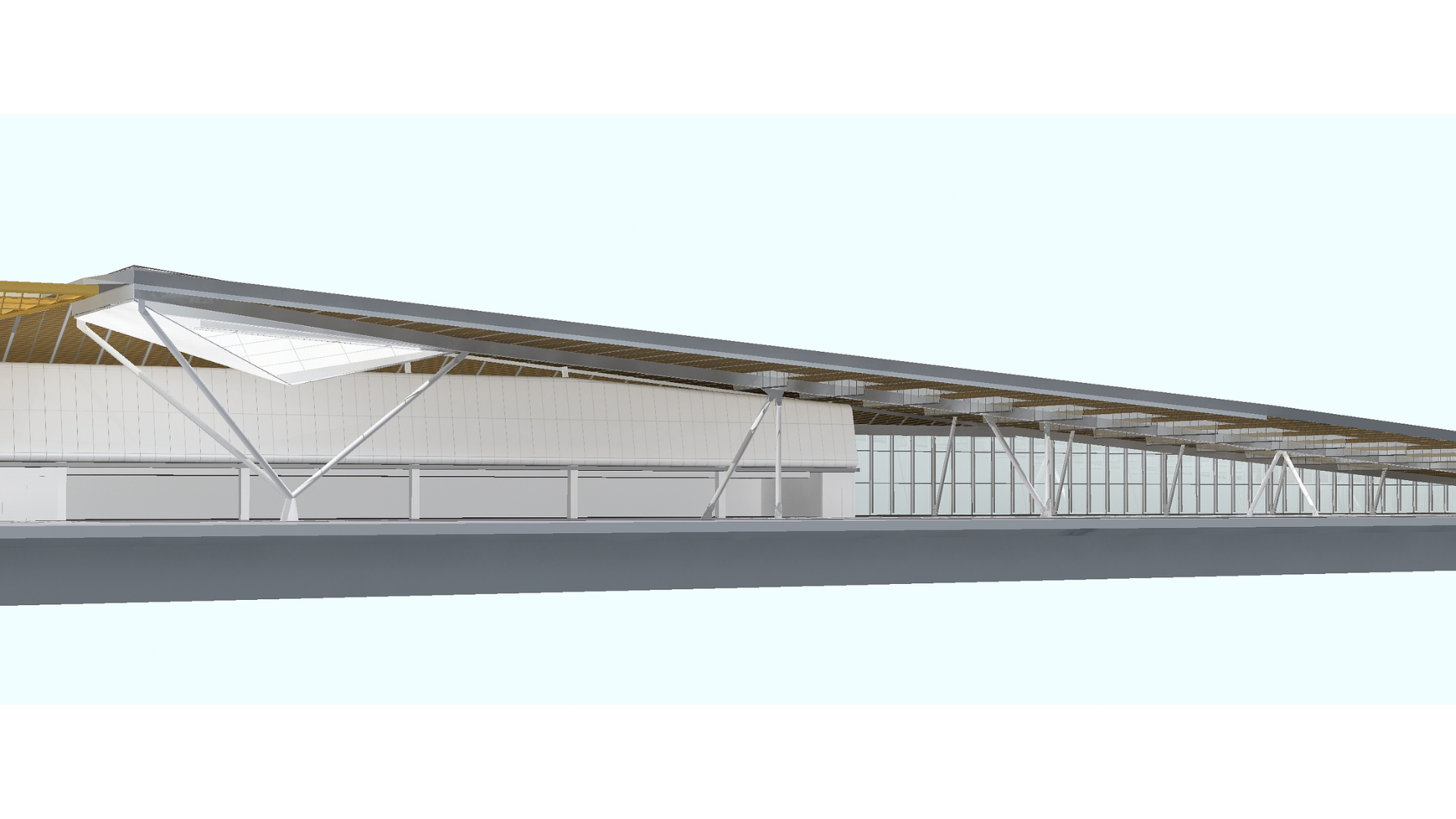 The concourse ends are 500-foot long structures that taper in both width and elevation, featuring exposed steel with 84-foot clear spacing between branched columns and triangular shaped skylights supported by a three branch column tree.